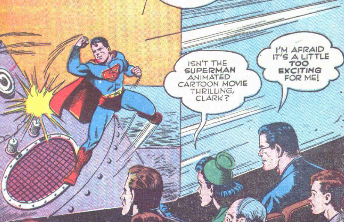 In Superman #19 (September 1942), we find what I can only assume is an intentionally-whimsical story in which Clark Kent takes Lois Lane to the movies and Clark has to prevent Lois from seeing key parts of the Superman cartoon to protect his actual secret identity from being discovered. Of course this makes no sense from the in-universe logic that has been set up thus far (why is it ok for every other person to learn of Superman’s secret identity but Lois Lane?!?), but I suppose it was amusing to read at the time, given how popular the cartoons were reported to be.