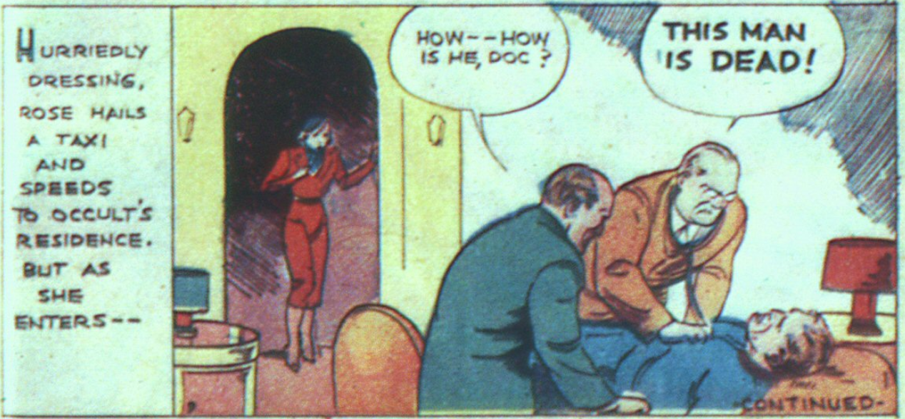 Superheroes die all the time these days and are resurrected in various forms months or years later, so it’s kind of meaningless. However, back in May 1937 it wasn’t so common, so I’m sure this cliffhanger where Doctor Occult is declared dead was upsetting to fans of Leger and Reuths’ “More Fun” strip.