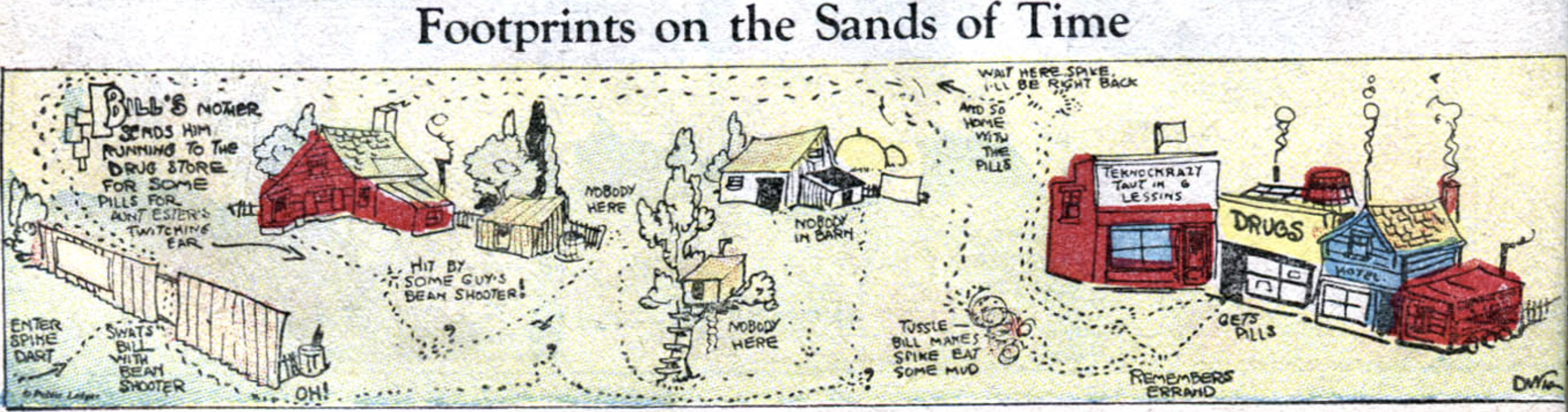 A single panel comic reprinted in Famous Funnies #4, October 1934 by Clare Victor Dwiggins. Every comic seems to be the same thing: Dotted lines depicting Bill’s adventures in the town that day, often getting distracted or into mischief. Clearly an inspiration for the dotted lines in Family Circus.