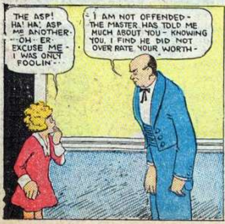 44 – Annie Meets The Asp 2019-01-13 No Comments Little Orphan Annie, February 1938 Popular Comics #27 (February 1938) has Little Orphan Annie meet The Asp, Daddy Warbuck’s other Asian bodyguard. Tags: 1938, Dell Comics, heroine, Little Orphan Annie