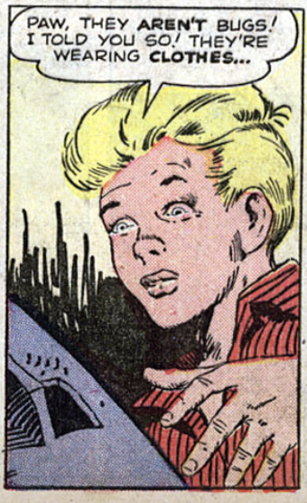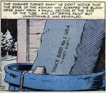 In Marvel’s World of Mystery #3 (July 1956), a young boy and his farmer father encounter what appears to be a small space ship and some “bugs” in their barn. The father dismisses it all as “junk” and tosses it away, but the big reveal comes in the last couple panels: The “junk” is really Earth’s first attempt at an interstellar rocket and the bugs are actually humans – the farm dwellers are giants.