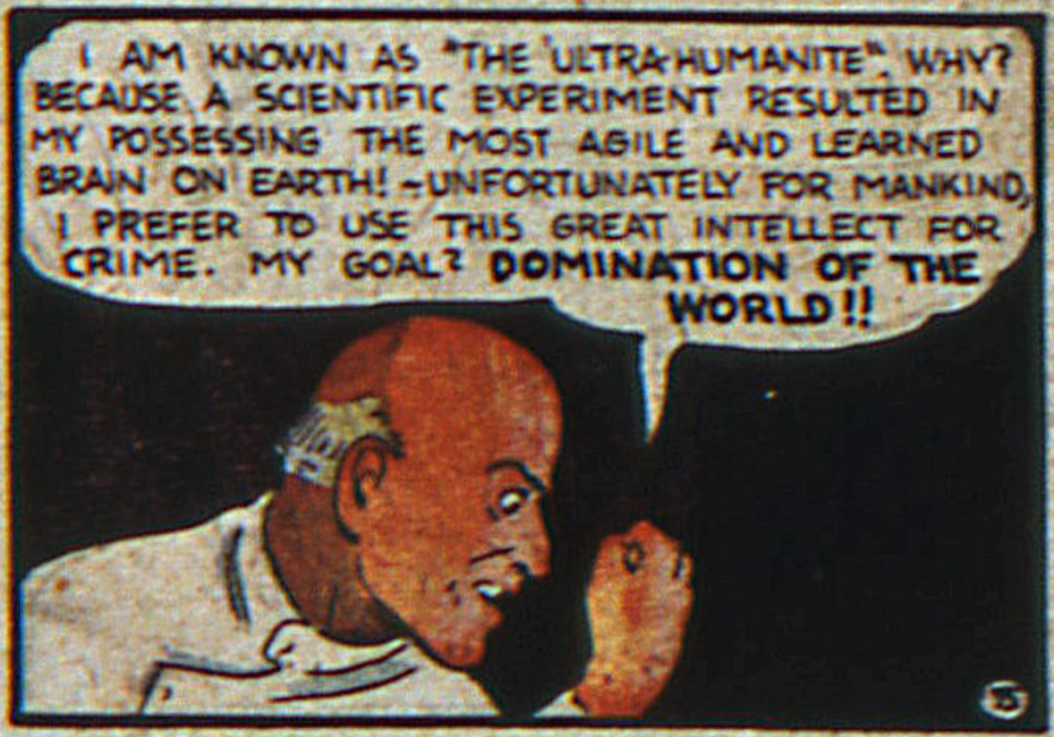 In Action Comics #13 (May 1939), Jerry Siegel introduced the first super-villain to the Superman mythos with the Ultra-Humanite. A “paralysed cripple” who was also a genius bent on world domination. He is revealed to be the mastermind behind the “cab protective league”, a corrupt cab company that shakes down smaller cab companies for protection money.