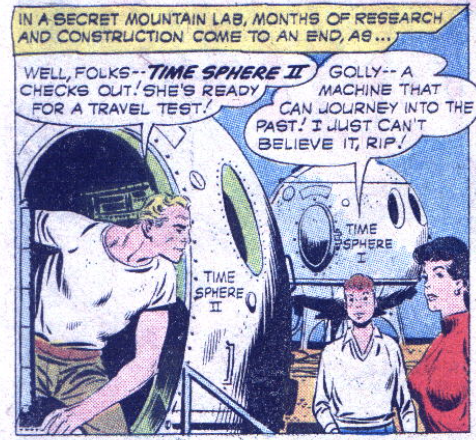 Showcase keeps cranking out characters, with Rip Hunter debuting in Showcase #20 (March 1959). Rip Hunter is a blonde, handsome, t-shirt-wearing, but sometimes shirtless scientist who invests a couple time spheres. With his companions Jeff, Bonnie and Corky they initiate a series of adventures across time. This first adventure lands them in the prehistoric days facing off thieves who stole a time sphere as well as dinosaurs.