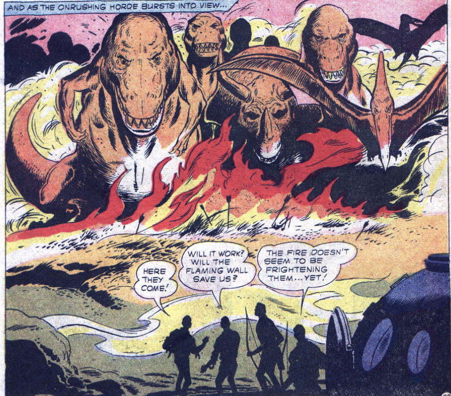 Showcase keeps cranking out characters, with Rip Hunter debuting in Showcase #20 (March 1959). Rip Hunter is a blonde, handsome, t-shirt-wearing, but sometimes shirtless scientist who invests a couple time spheres. With his companions Jeff, Bonnie and Corky they initiate a series of adventures across time. This first adventure lands them in the prehistoric days facing off thieves who stole a time sphere as well as dinosaurs.