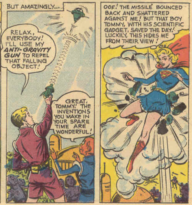 In the same issue that debuts Bizarro-Lois, Supergirl is told by her mentor, Superman, to practice breaking the time barrier. She races off a hundred years in the future and meets a genius orphan named Tommy. Supergirl saves his adopted parents from disaster and writes about it in her diary once she’s back. It turns out the kid she rescued is the future Tommy Tomorrow of the Planeteers!