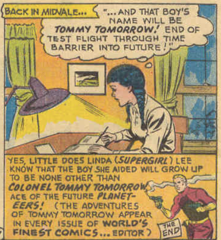 This is the moment when it is firmly established that Tommy Tomorrow is part of the mainstream DC continuity. Maybe there was some worry when Supergirl feature displaced Tommy’s feature in Action Comics that readers would not know that his adventures still appear in World’s Finest Comics?