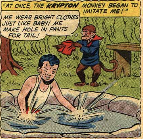 Beppo, the Super-Monkey makes his debut in Superboy #76 (August 1959). Unnamed in this first story, the monkey is one of Jor-El’s test animals that snuck aboard Kal-El’s rocket before it left Krypton. Young Clark eventually tricks the monkey to be chased out into space. Beppo will be back, and eventually joins up with other Kryptonian pets like Krypto…
